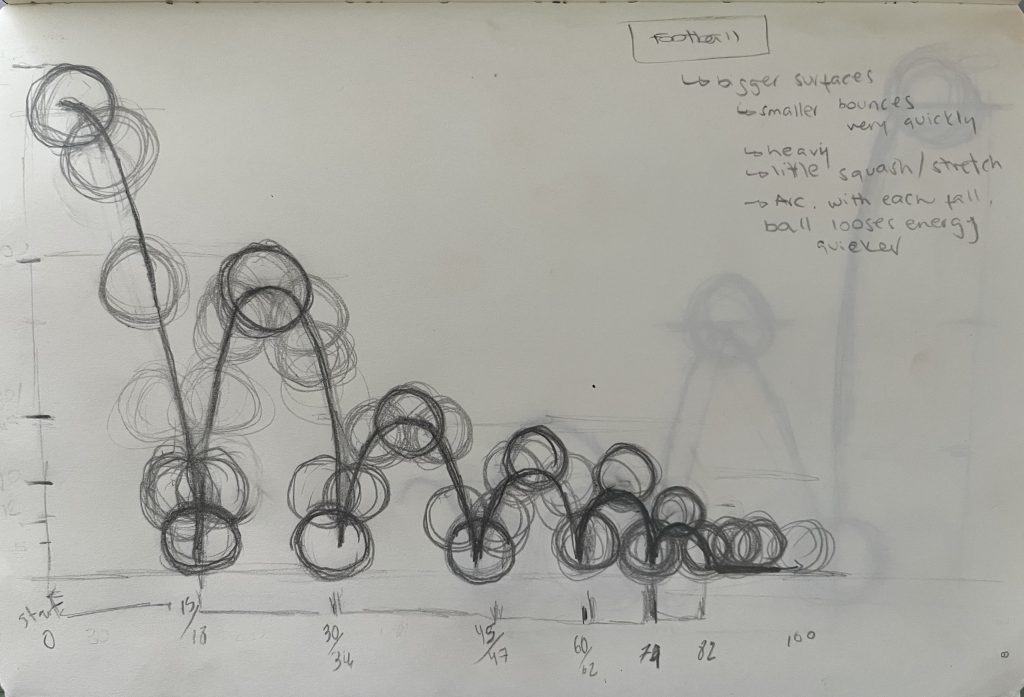 Our first attempt at animation involves studying how a ball bounces and planning our own bouncing ball. At home, I watched the recorded class and the provided videos, following them closely. I started by searching for bouncing ball videos and choosing the football ball from this video: